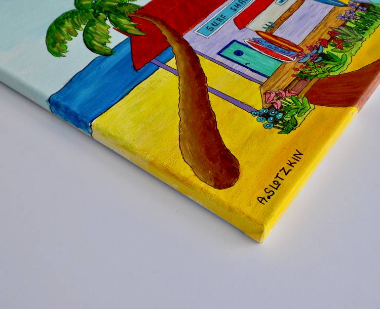 I been living in Hawaii most of my life [ feel very lucky ] . The first thing you notice when you arrive here are the bright colors that all around you ,the flowers the ocean and the sky always bright. So for my painting.....always very bright colors ,I work in acrylic and ink and mostly paint some thing that connected to the ocean. I consider my style folk or naive style ,I like to call it a cheerful style.