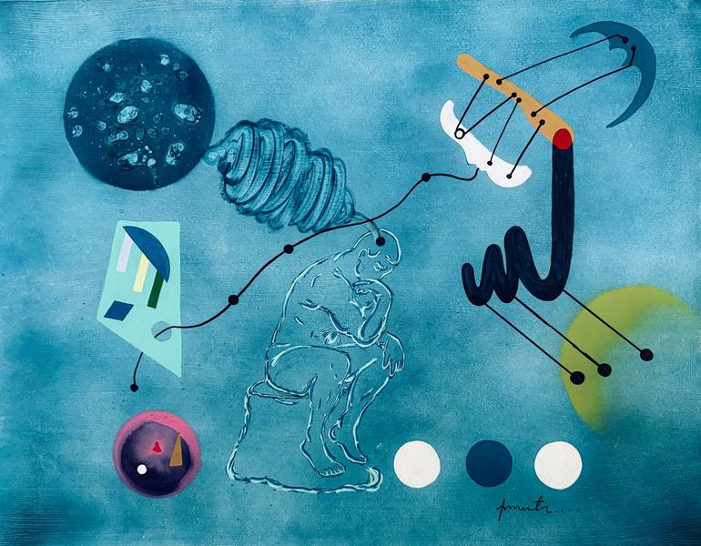 The Thinker and His World” immerses the viewer in a surrealist meditation where abstraction, geometry, and celestial motifs orbit the human condition, revealing thought itself as a fragile marionette suspended in the vast architecture of existence.