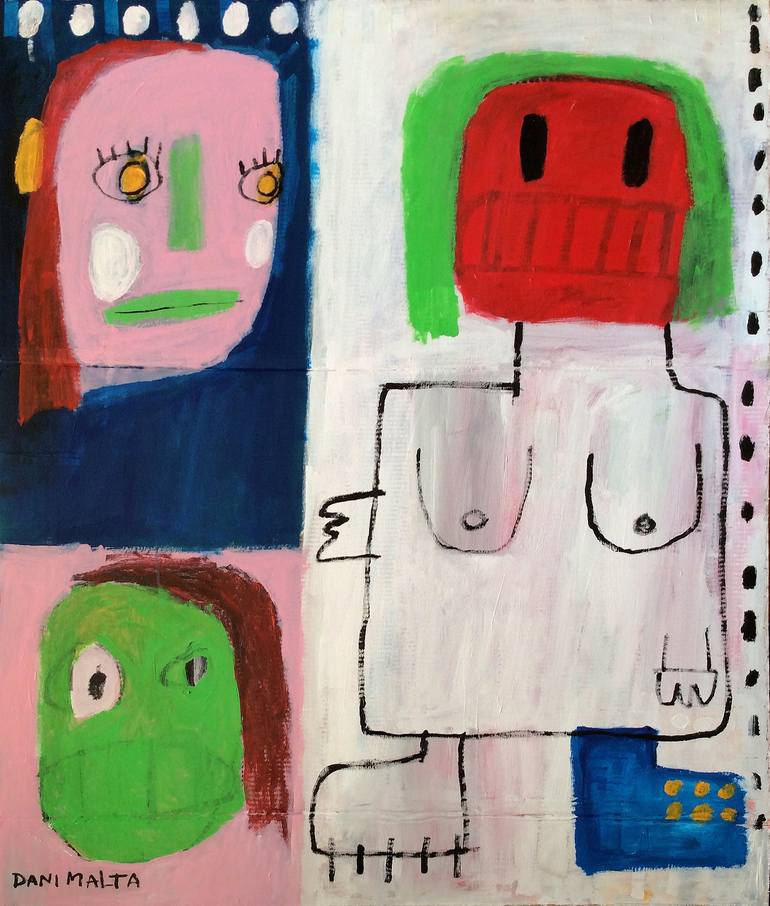 His work consists of acrylic and pastel paintings, which are, in style, very much influenced by the neo-expressionism movement and the street art. He uses cardboard boxes as his primary surface to achieve an aesthetic full of texture and impact. Daniel loves to explore, with a degree of uncertainty. He visualizes an idea and uses a flow of movements in order to achieve the effect he’s looking for meaning he is never sure how it is going to end. This combined with a range of different colours and textures results in vibrant and intriguing end pieces.