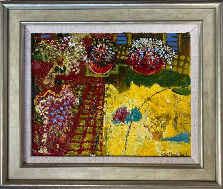 Take this painting to bed instead of a book. Relish poetic interpretation of life in paint. This painting is inspired by my garden. Enjoy early summer morning sunlight. The painting has the feel of a Persian rug.