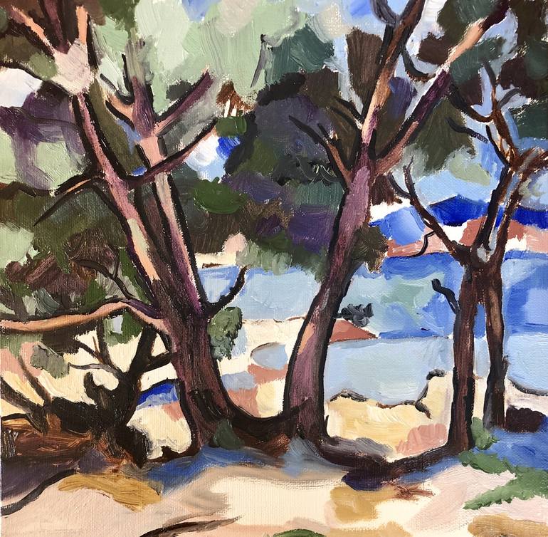 Inspired by the Scottish Colourists, this painting is in my favourite square format. The view through the dark trees to the bright blue sea with a hint of mountains beyond. Painted in my Sussex studio from a photograph. A little gem for your room.
