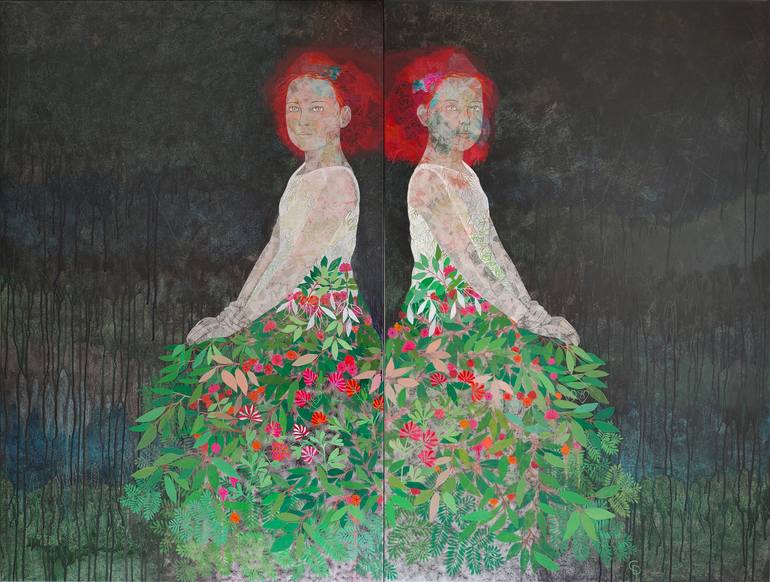This painting deals with a subject that the artist regularly addresses: the double and twins. Diptych of 2 canvases 120x80 cm Acrylic paint and fine paper mounted on the canvas.