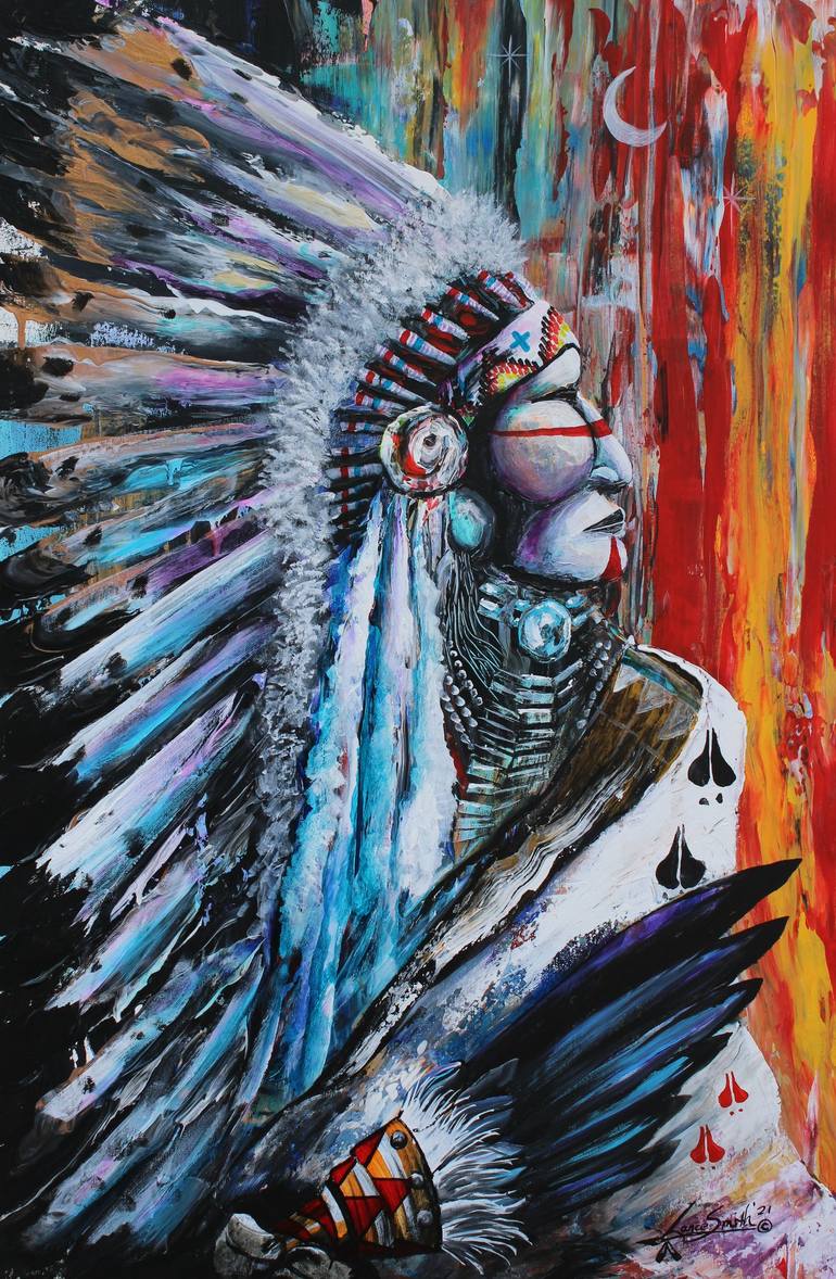 Native American chief, noble warrior. All feathers for his war bonnet were earned not given painted with acrylic and alcohol-based inks and watercolor.. truly one of a kind piece the large, colorful, unique