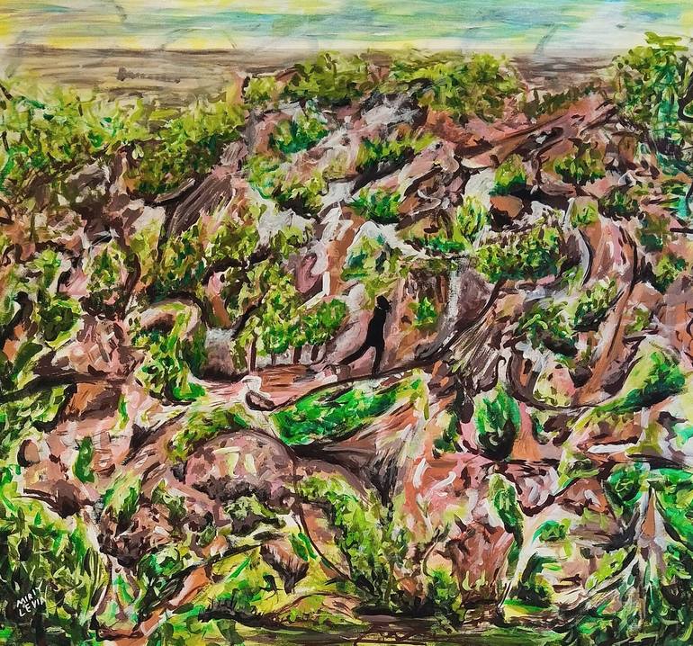 Landscape abstract painting original , abstract nature painting on canvas, trees, mountain, bush's , hills, far view. Wild nature . Name: 'The way up' This is Intuitive painting. Handmade, brashwork. Original Acrylic painting on canvas Colors: Green, brown, beige and yellow