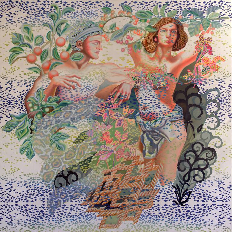 This painting is inspired by the Bible,Adam and Eve. Adam is picked in a Michel Ange Chapelle sixteen painting,(but is not the classical Adam),and Eve is the mix of many inspirations. Snake,fruits,basket and sea as background... I hope the viewer will feel the difference between this Adam and this ...