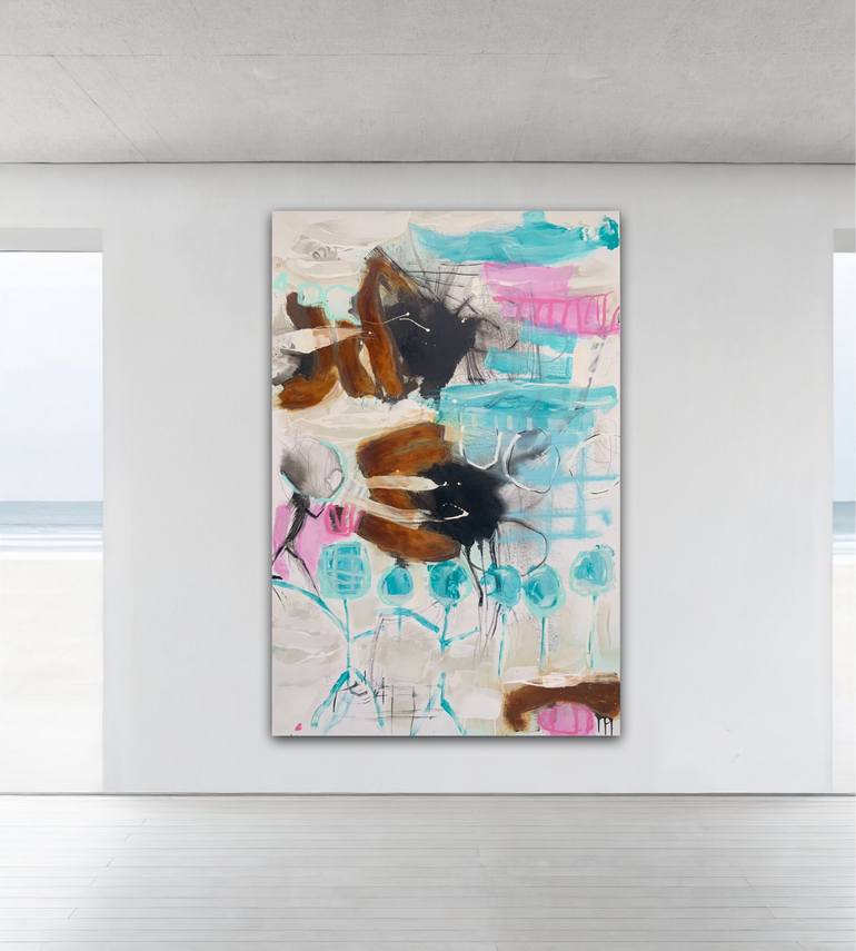 “There's something between us 2" is the second part of a mini-series of two and is a large-format, very special work by the artist. Here she has combined her abstract painting with a touch of figuration. If you look closely, you can see people communicating with each other. Interpersonal relationshi...