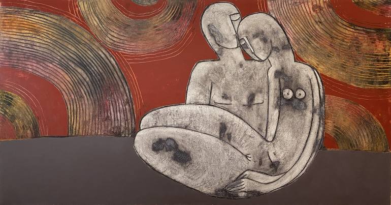 They are the ones who love each other, the ones who have everything. Highly stylized male and female figure in loving embrace. I used solid texture and paint layering. Warm colors. In paintings, I always look for that true, pure love.