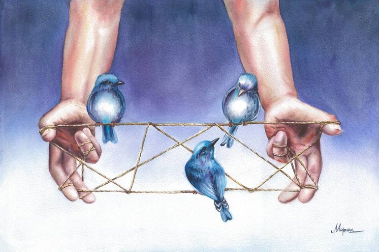 The painting is executed in watercolor technique, which imparts lightness and transparency. On the canvas, two hands hold delicate threads, as if engaged in a game or dance. The threads are refined, almost invisible, yet they clearly define the composition's boundaries and draw attention to the smal...