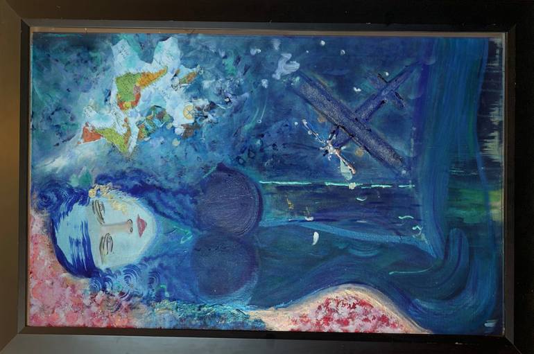 This is a self-portrait using acrylic, paper, and other materials. It was painted while at a time when I was really missing a friend overseas. The blue tones are representative of the oceans between us, but also give the painting a relaxing quality. This piece is sure to bring peace and calm to the ...