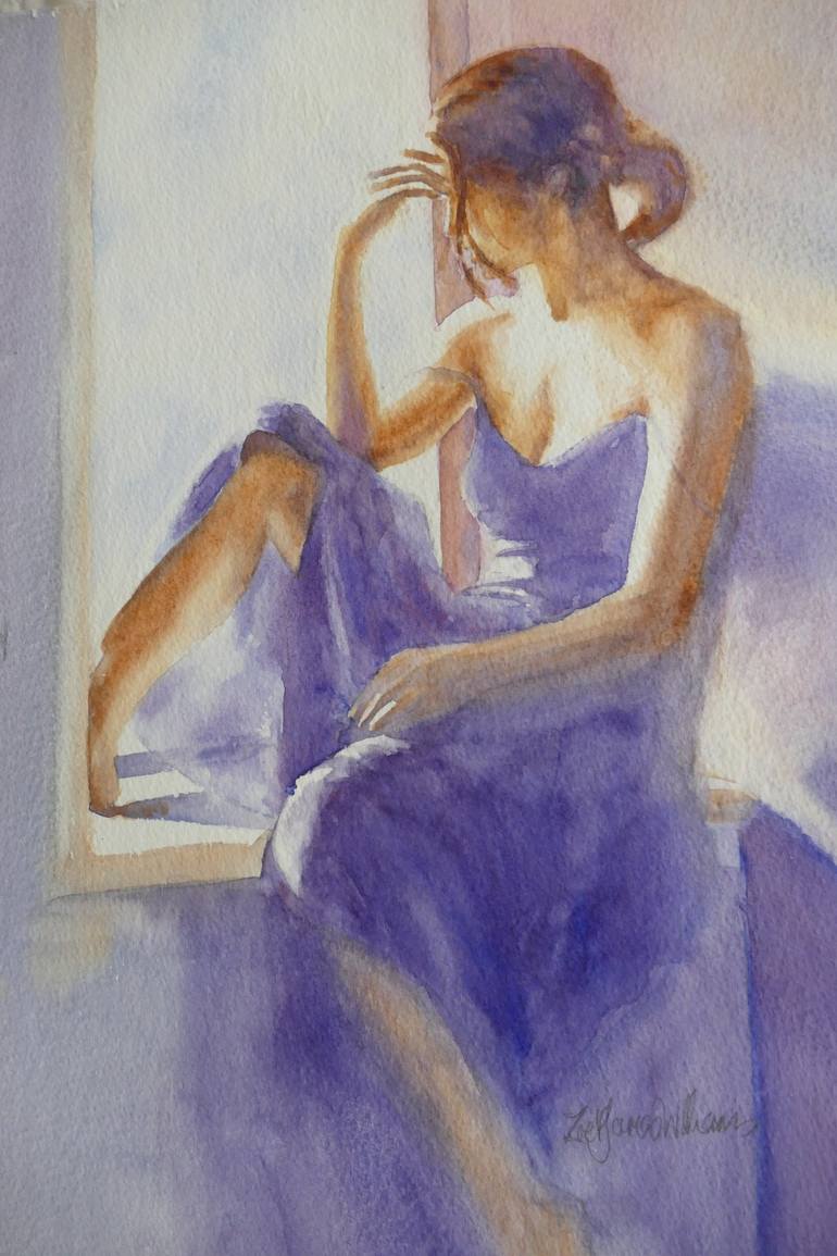 A beautiful woman sitting in a window looking out of a window. Is she looking for someone? Remembering a moment with a loved one? I painted this peaceful and thoughtful pose is soft purples and sepia watercolours on watercolour paper