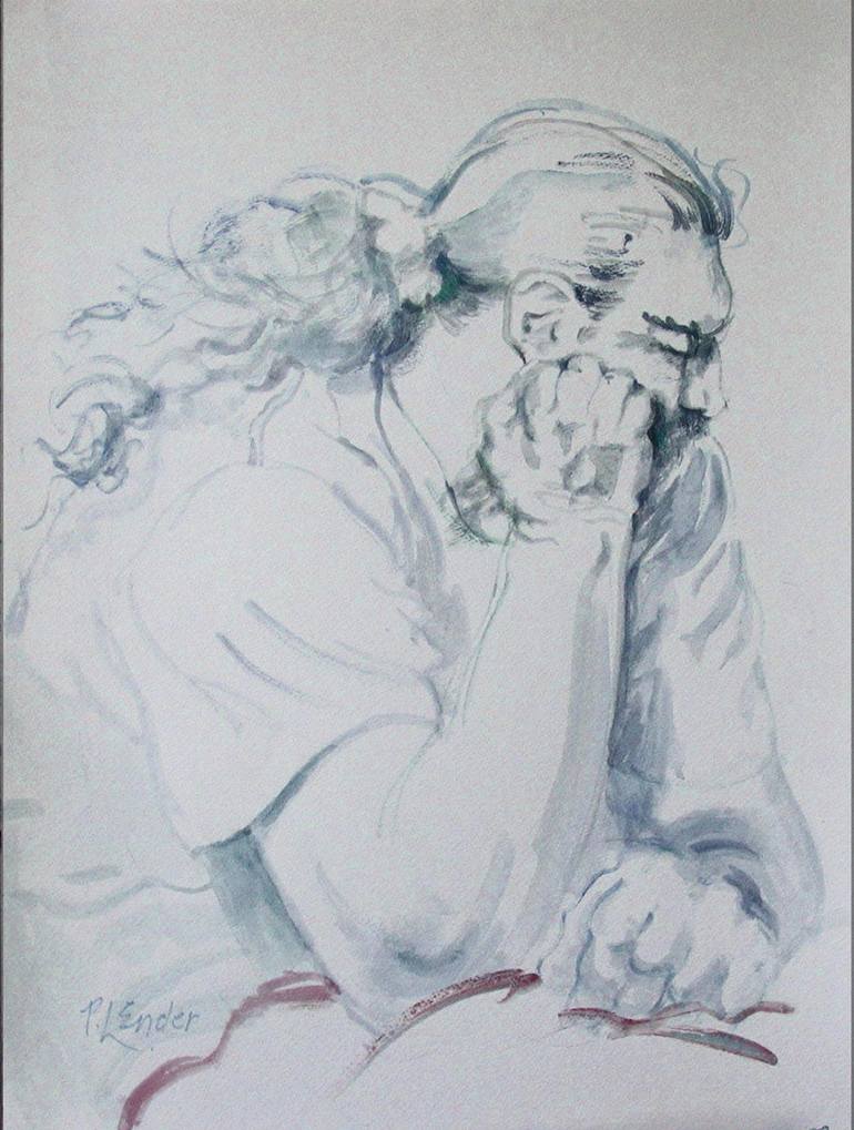 A muscular man thinking. Painting in blue acrylic paint on watercolor paper painted loosely and freely with brush. An introspective portrait of a thinking man. Signed. Certificate of Authenticity. All my sales go to charity.