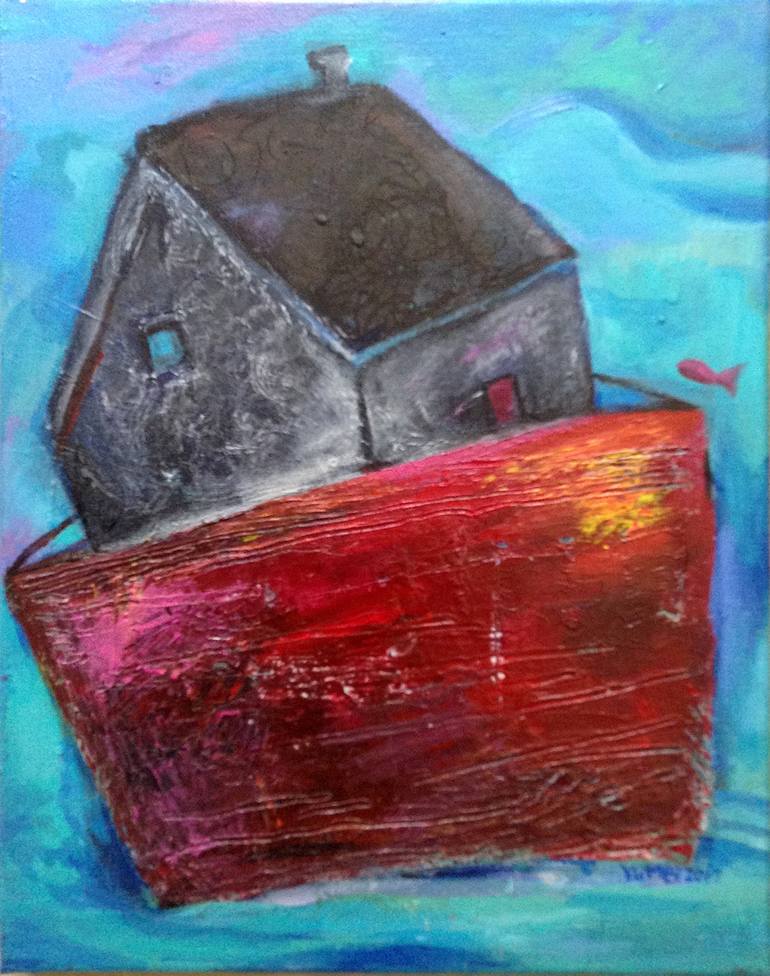 "This Small Red Boat" painting on 11"x 14" canvas. It will come with a wooden frame show in the above pictures. It is ready to hang.