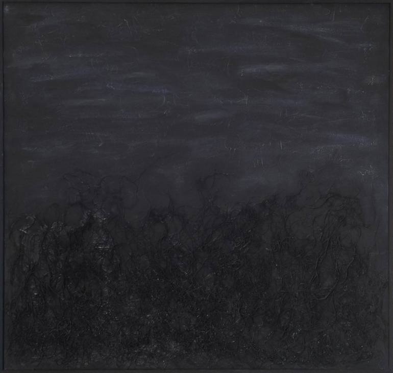 A dreamlike meditation made of unwound string, filler and various paints. Part landscape, part turgid pool, part invented space, part stormy sky. Liminal and haunted, yet familiar. We see a stormy sky, deep water, an oil spill, a mountain range seen through mist, over reaching vines or tangled reed...