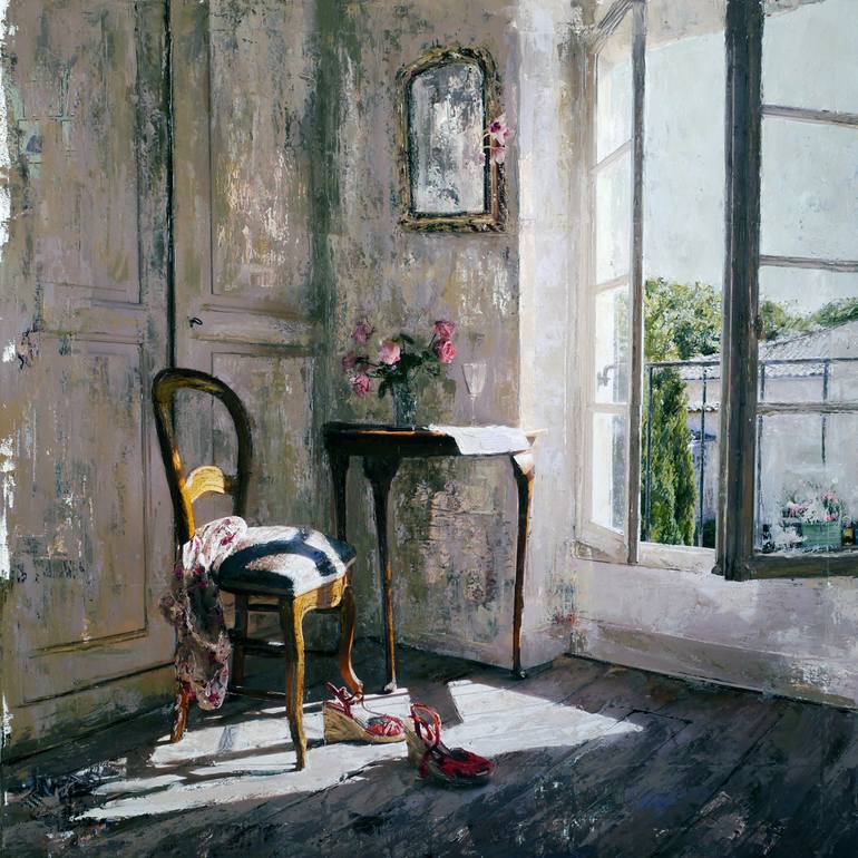 This is one of a number of paintings I painted on the theme of chairs. They are such evocative objects and as with so many of my works, it is the everyday objects that are elevated into the spotlight. The summer sunlight streaming through the open window inspires you to dream.