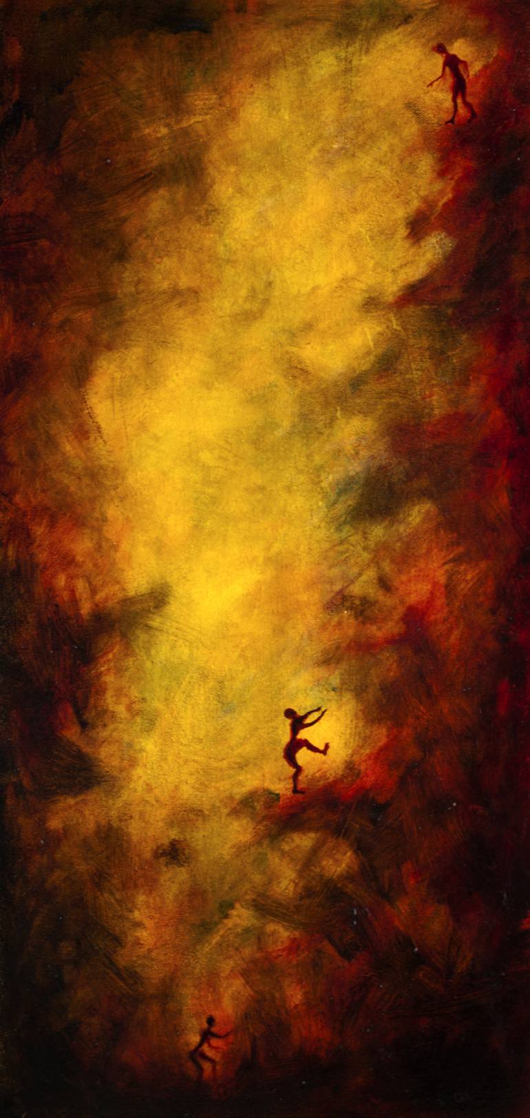 Strong yellows and dark reds, suggested rocks that three tiny people are climbing. Layers of indian yellow create a beautiful effect of an evening light enhancing miniature silhouettes of the three rock climbers.
