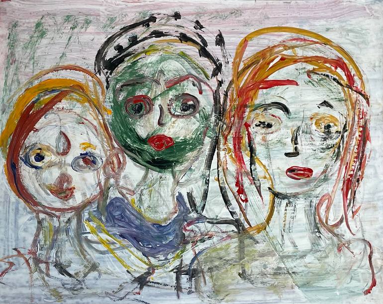 This piece are three separate women figures, lots of grays and cremes for the background and highlights in reds and oranges and green for the women. All three figures are different in stature, semblance and beckon to the viewer.