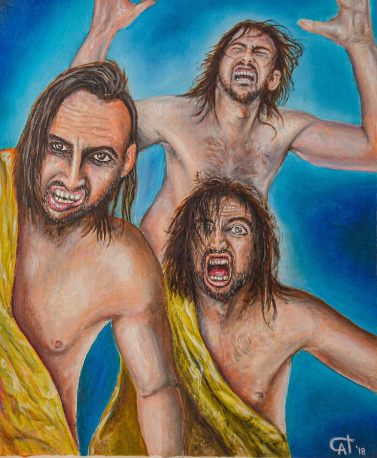 The artist has more than one person inside and some of these represent a caveman, a crazy man and an angry man. Play with archetypes and emotions in a blue void. Oil on canvas, satin varnish finish.
