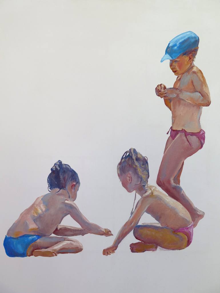 On a Spanish beach, two girls play with the sand while another approaches them. Monogram on the cap. Signed and dated on the reverse. It belongs to The Blanche Line series that aims to reflect the reality of the contemporary world. Professional packing. AntiCovid protocol.