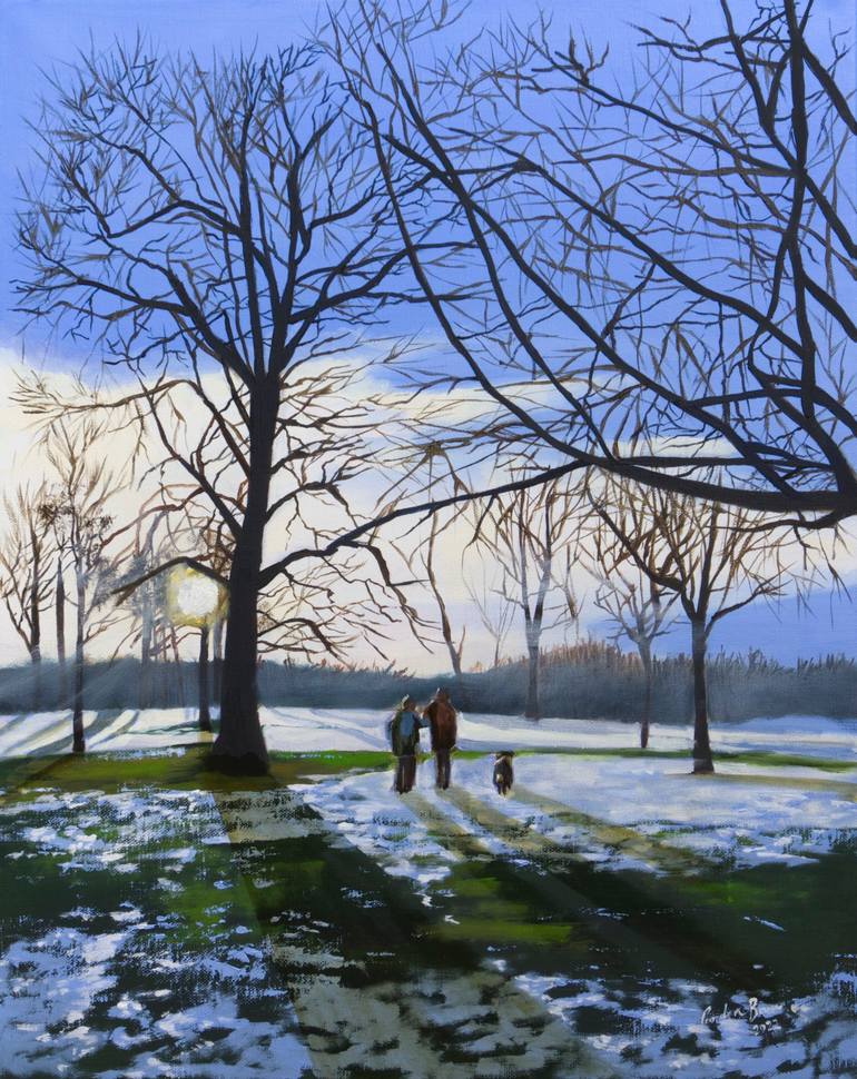 Ever since I first watched Bob Ross's The Joy of Painting as a child, I have loved painting winter landscapes. A few years ago, I took a photo of this scene in wintertime close to my home. The dog is being walked by an elderly couple. This painting is an oil on canvas. Its dimensions are 20 by 16 in...