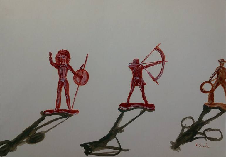 West Coast this is the painting in oil on cream paper for the special project the old west toys Original Print on paper woodcut technique signed by Roberto Scala visual artist, born in Sorrento but lives and works in Milan. He collaborated in the nineties with the Mudima Foundation in Milan as assis...