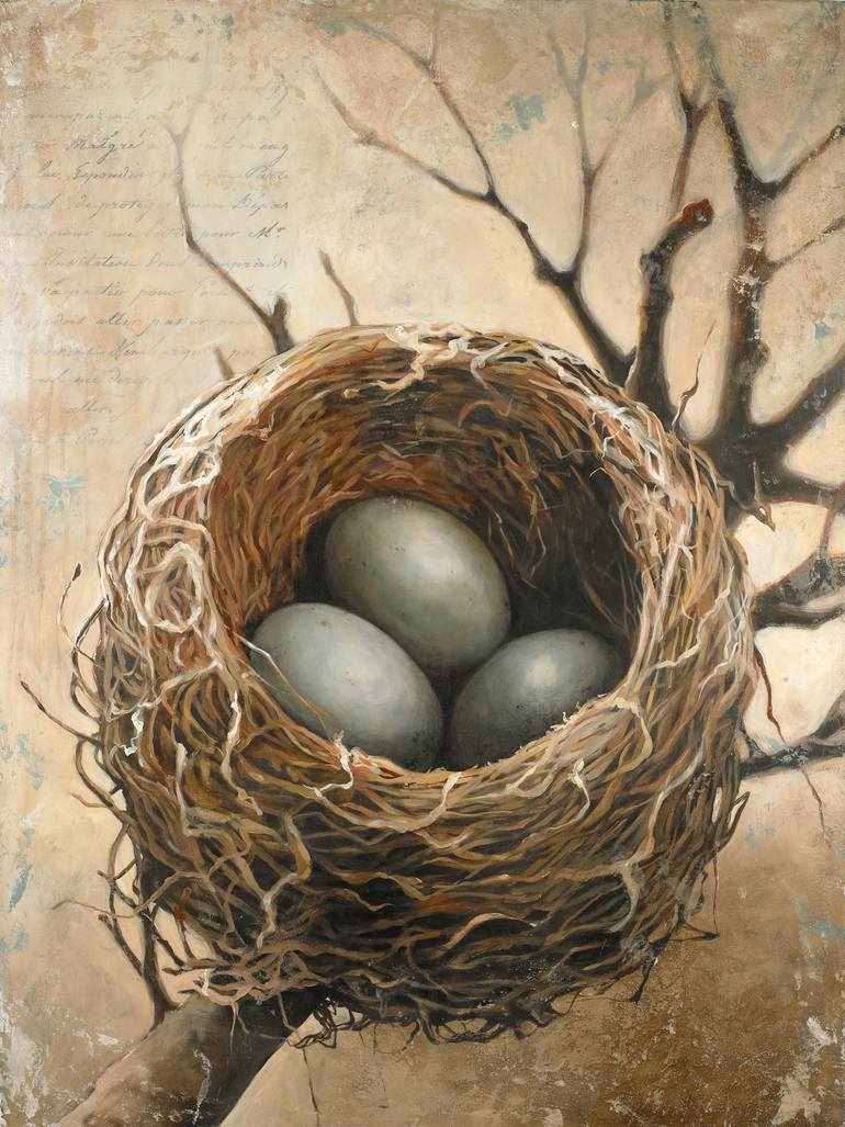 This piece is the fourth nest painting in an ongoing series. It is painted from an actual nest that was found on a fallen branch near my home. I am always on the lookout for nests to rescue and bring back to life through art. The large scale and textures of the nest are meant to entice and delight t...