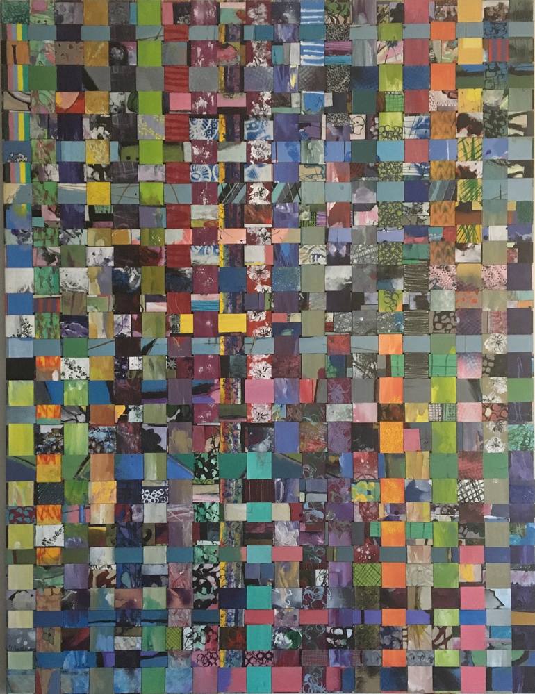 “All people experience hardship, heartbreak, loss, or pain of some magnitude. Struggle is one of our common denominators as human beings. Times of struggle matter tremendously. It makes us empathize. It makes us stronger, and gives us our sense of humor. It’s what makes us. I started weaving canvas at a particularly trying period in my life, during which one of my works was damaged beyond repair. So, I pulled it apart and started cutting, adding paint, weaving, adding more paint until it was complete. I was pleased with the repurposed painting. It became a stronger composition than the painting that I thought had been destroyed. My work has always expressed itself this way, I like the therapy of the process.” DeMartino’s inspirations have always come from life experiences. Around 1997, she started a series called “Windows”. These paintings explore geometric design patterns along with flowing brush strokes and random stamps and markings. Along with that, she started a mixed media series of mosaic style canvases where she explores one concept and interprets it in hundreds of small paintings. She has also been working on her series of intricately woven paintings. She started painting when she was very young but believes becoming a mother turned her in a different direction as an artist. “Things came out of me differently after I had the kids. The paintings I started making were more intense, I think I got better.” She tends to work on more than one body of work at a time and enjoys exploring different styles. DeMartino did her foundation year at Parsons but decided Fine Arts was her calling and later attended The School of The Museum of Fine Arts in Boston. She has lived on both coasts and now resides where she was born and raised, in Philadelphia with her two kids and a dog.
