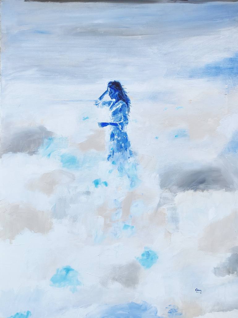 Acrylic and gesso on canvas. Fantasy scene of people walking through the sky. I return to my old series of walks in the sky. My inspiration is the Light and the Calm in an atmosphere devoid of any material element.