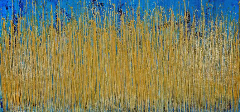 Vibrant expressionistic Inspired by nature abstract blue background with burst of many shades of yellow, gold, clear paint and subtle iridescent clear blue drizzles. This artwork arrives in a tube, signed in front. Unframed dimensions 100 W x 48 H I include a certificate of authenticity that lists...