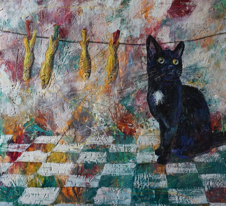 Pure encaustic, hot wax, and pigments on OSB. 2022 This painting is part of my Series of The life of cats. Cats are very sensitive animals. Everybody who lives together with their cats as partners and not as owners know how emotionally sensitive they are. This work was made to order alongside an...