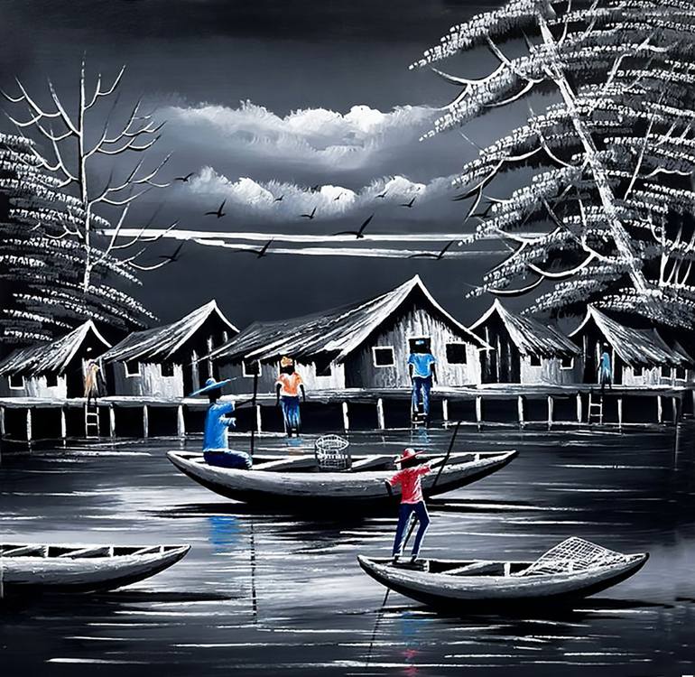 This Painting depicts ephemeral havens of simple life of rural seashore dwellers. We see the discipline of their organization, where everyone learns and knows their roles and get to work everyday. Its a story with lessons for organization, teamwork, expertise, diligence and hard work. All qualities ...