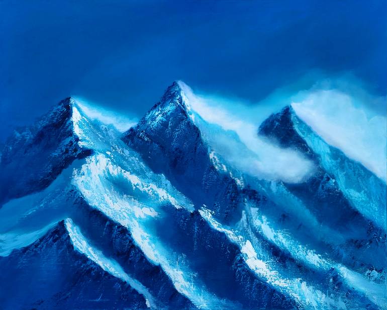 A rhapsody in Blue and light. "Tide of the Peaks" presents the mountain range as a rhythmic swell, capturing the intersection of stony endurance and atmospheric fluidity. It serves as a powerful bridge in the series, connecting the vast horizons of the coast to the majestic peaks of the interior. ...