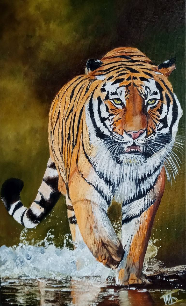 Tigers are the largest wild cats in the world. Since I love painting cats, tigers are not a small part of my art work. Their soft large paws, long body and tail add grace to this animal. Enjoy my arts. Oil painting on professional cotton canvas. Size 36 x 58,3 cm The side walls are painted. Paintin...