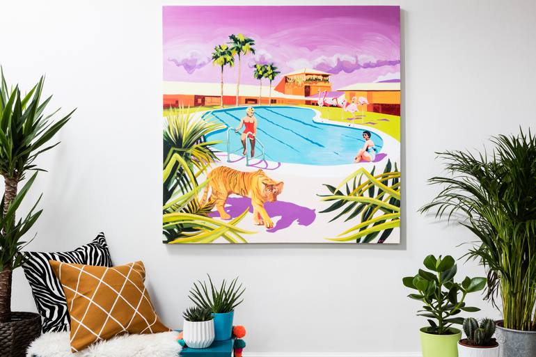 Ruth Mulvie is a contemporary fine artist, known for her vivid palette and for the delightfully unexpected detail in her paintings. She graduated from the Glasgow School of Art and over the years comparisons have been made with Hockney. She cherishes that visceral connection that Kodachrome™ gives us with our past. That single moment frozen in time that one can look at forever. Old photographs are her initial inspiration for each new piece; a digital springboard atop which she dives into her latest delicious fantasy landscape. Mulvie’s colour choices yell and fizz. They quicken the heartbeat. Sherbet yellow next to candy pink or lime green besides turquoise, they all elevate the mood. In her paintings we are invited to join the most wonderful party or shared experience. Mulvie’s realms surprise and delight. Hers are playful, glamorous worlds with pure glee for oxygen. And in each we are granted a day in happy valley. At the heart of Mulvie’s pieces is the palpable joyfulness in her response to colour. She is at her happiest when mixing and combining paint, waiting for the thrill of the perfect shade. For her, colour is emotion, colour is memory, colour is her favourite place to be. And we are all invited. There’s no place like it. Julie Tellouche Of her own work Mulvie says: "I usually paint with oils and I dedicate a lot of time to the process of simply mixing and combining colours, hence the highly unique and distinctive palette you can see in my work. Things I love include classic beach scenes, 50’s America, vintage fashion, dancing girls, disco queens, dog walkers and more - a vast and varied array of subject matter I unite under the broad theme of “pleasure”."