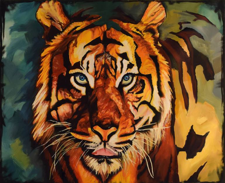 Oil on canvas The gaze of the tiger, of the tigress in this case. The color, the composition and the intensity in the purest comic sense style. The face and that intense and female look are the protagonists, while barely a few strokes are lost to insinuate the body and the posture of the animal, ca...