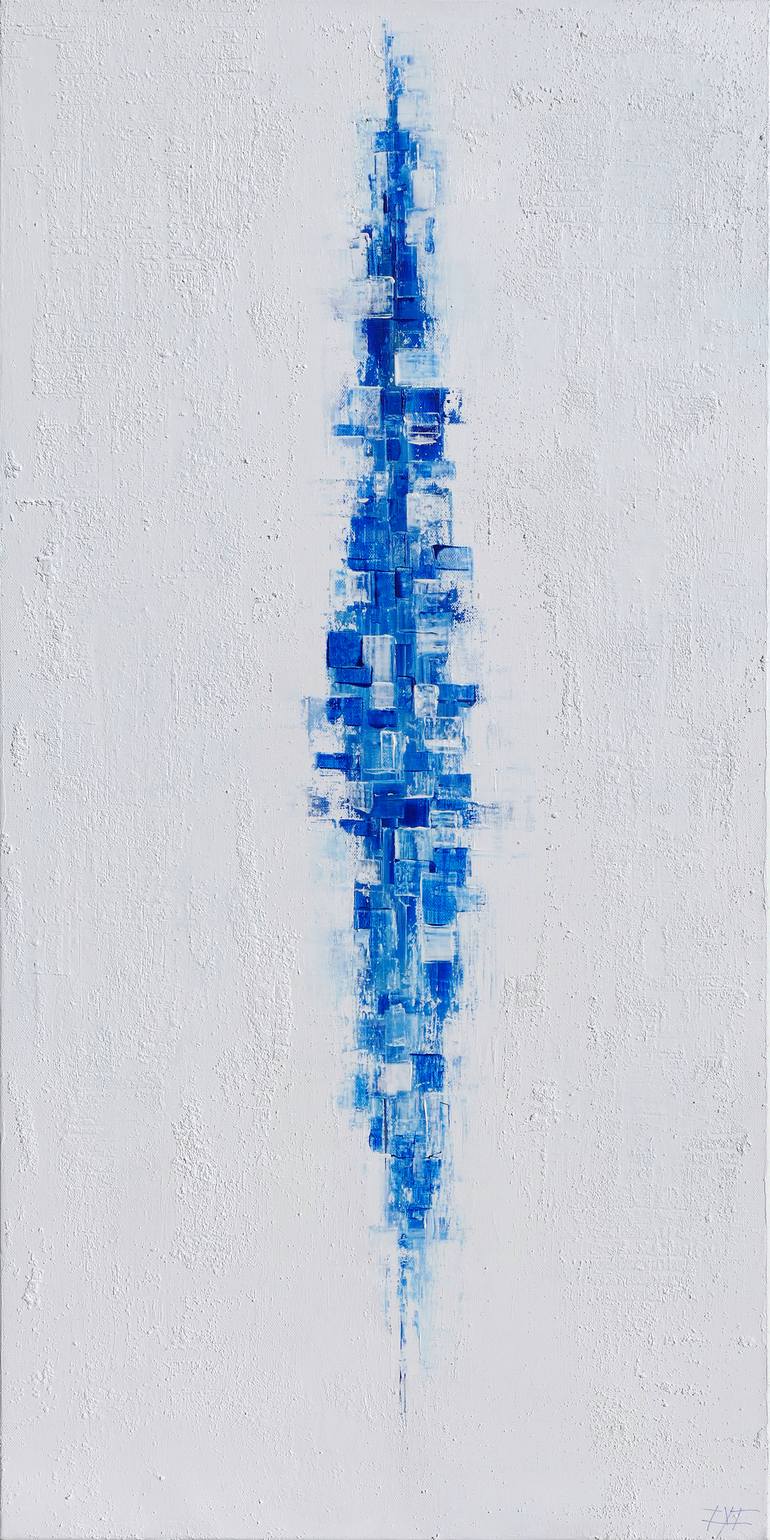 Does time exists by itself or is it a construction of our mind? A vertical blue structure in a "sea" of white. Acrylic on canvas with gloss varnish. «3D» wood frame (1.5 inches sides painted in white – no need to frame). All my paintings are unique works entirely handmade. No reproduction or mass p...