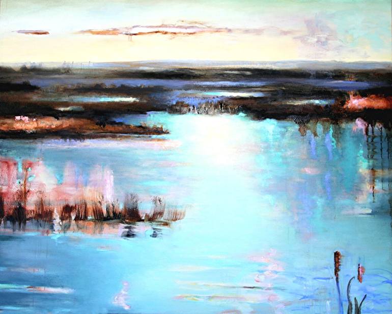 My landscapes are not based on any actual places or vistas, rather they are a result of the compassionate observation of Nature, filtered through my memory and imagination. I intend to evoke a peaceful and contemplative mood but also to allude to the possible loss of the Earth as we know it.