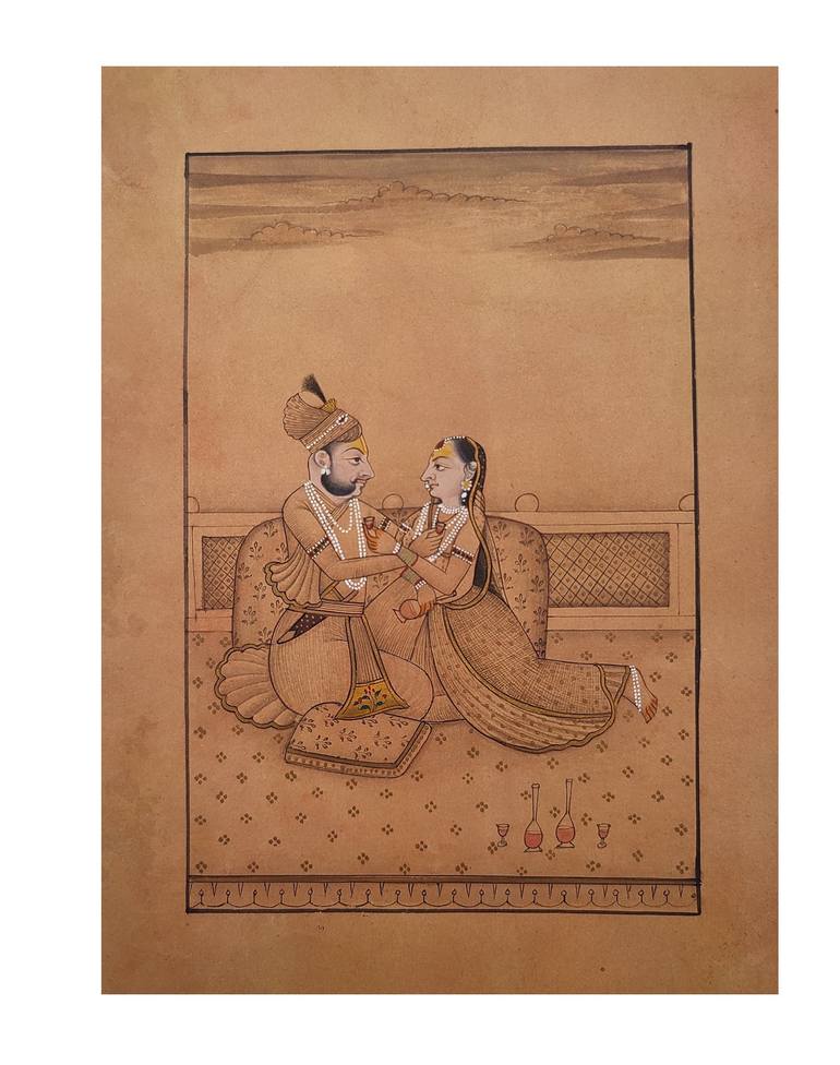 Handmade Indian miniature painting of love scene, This rare and unique Indian Love scene painting is made by Me in year 2001. A Hindu maharaja and maharani are sitting on the terrace of Royal pace on the Carpet. Gazing deeply into one another’s eyes, a loving couple enjoys the cool of dusk, a favou...