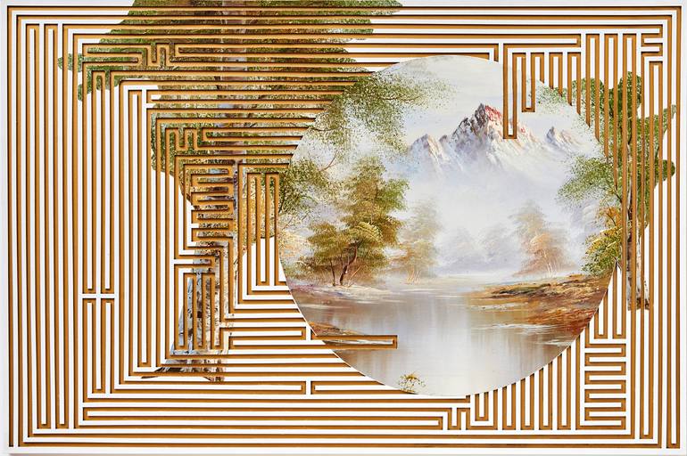 Oil painting on canvas. Cut up and mounted on 3 dimensional carved out and painted wood base (see additional photos) . White painted sides. Signed and ready to hang. Title borrowed from a JG Ballard short story.