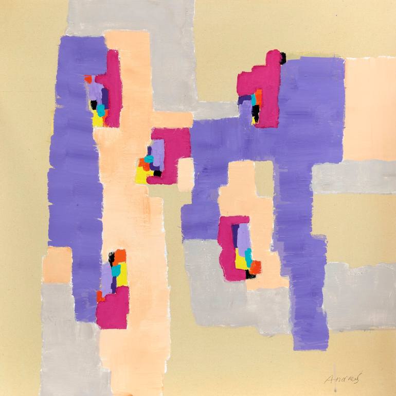 Annabel Andrews was born in the Isle of Wight in 1940 now lives and works in El Escorial near Madrid Spain, where the colour, light and volumes of the mountains inspire her work. As also her friendship with the late Spanish artists Pablo Palazuelo and Jose Guerrero. By preparing her own canvases with home made casein glue base and zinc white the work is light and luminous ready for applying acrylic colours.