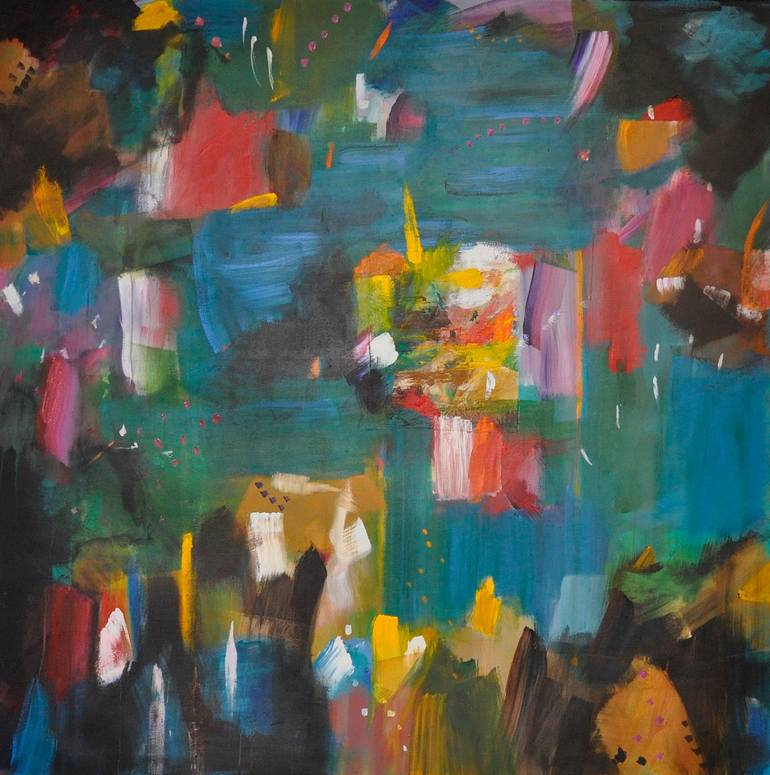 "Tortuga Pirata" is a densely work abstract painting in the realm of red yellow blue green coloring, concentrated in the atmosphere of deep space. Recently viewing the works of Jackie Saccoccio's Femme Brut, my paintings are changing, including randomness, density, and explosive mark making as domi...