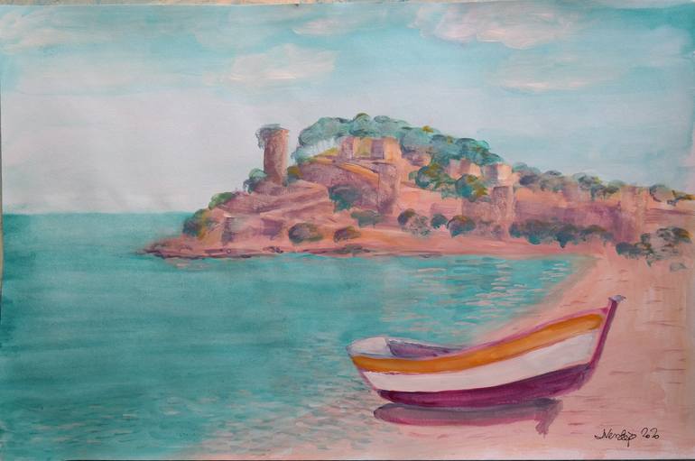 A view of the Tossa de Mar castle with a fishing boat moored on the beach in front of it.