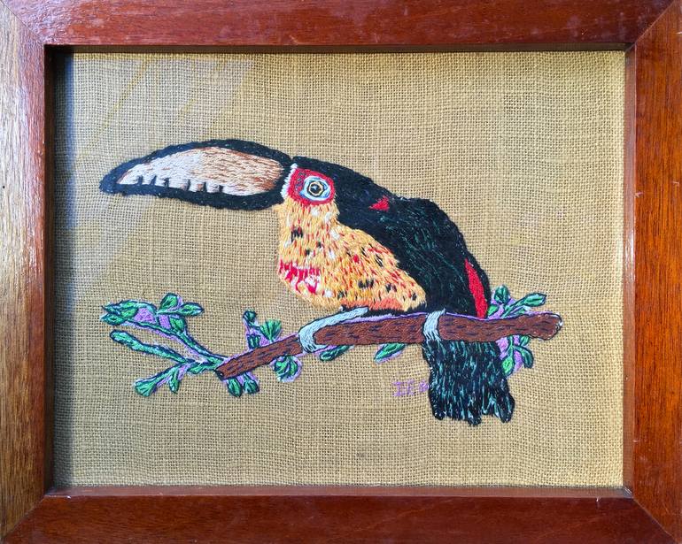 "Toucan" Ingrid Cayetano 25 x 33 cm (9.8 x 13 in). Thread on burlap. 2015. The Keel-billed Toucan is the national bird of Belize with a stunning huge yellow, orange, red, green and black bill. Toucans are one of the most iconic species of the Tropics, as they only occur in this part of the world.