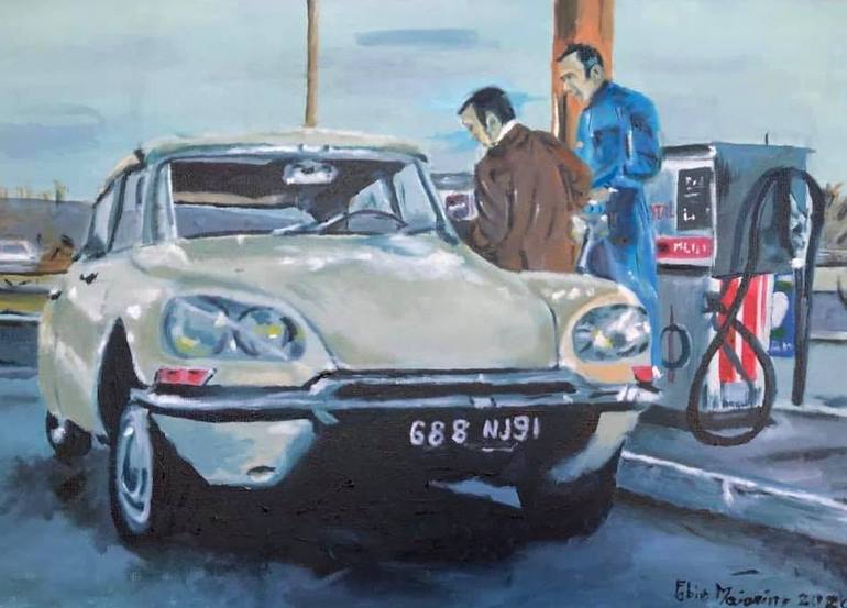 A classic car is parked at a vintage gas station, where a man in a blue uniform assists another man. The scene conveys a retro atmosphere with soft hues and a sense of nostalgia. It portraits a frame from a gangster film with the beloved Lino Ventura