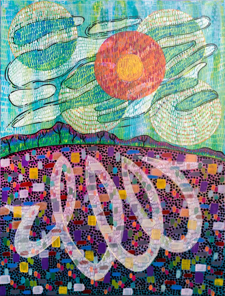 The sun transforms the world around. This is the atmospheric painting of a landscape in contemporary style. acrylic on canvas, the frame is 60x80x2 cm Stretched canvas, cover by vanish, ready to hang.