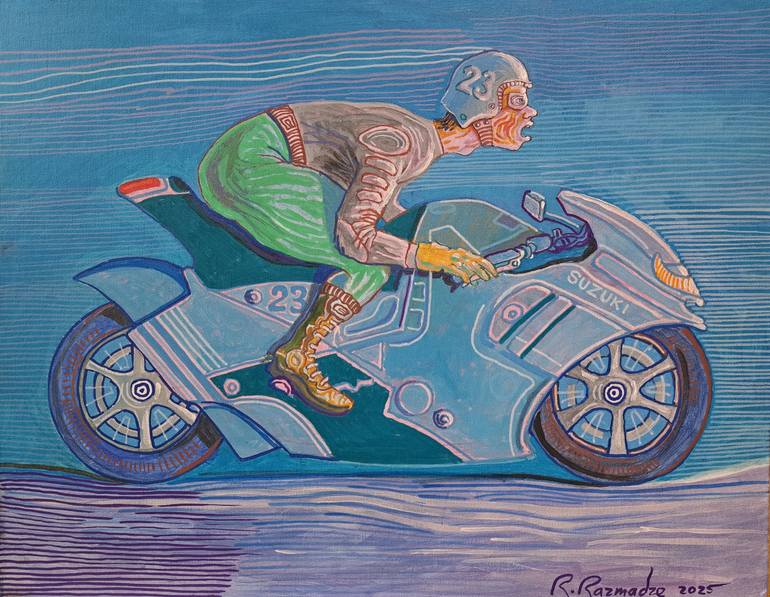 Original acrylic painting depicting a motorcycle rider competing in Tourist Trophy of Isle of Man.