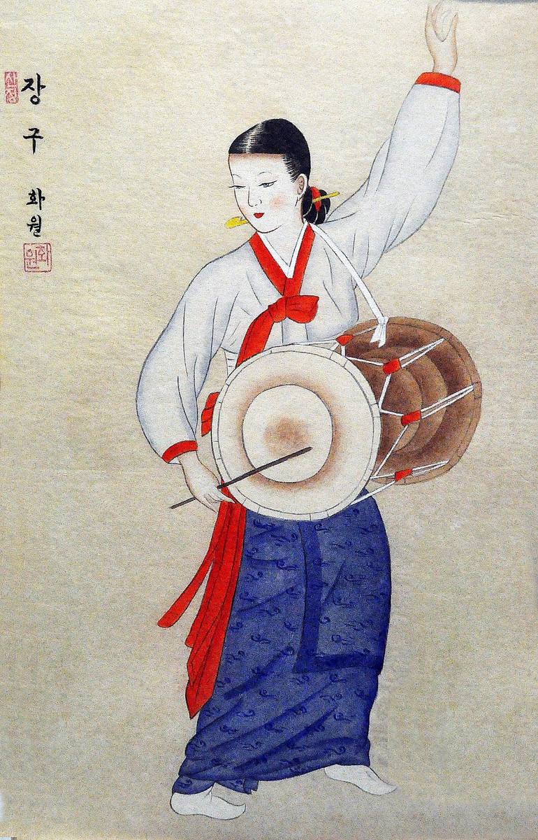 Vintage Style Traditional Korean Drum Janggu Portrait Water Color Painting Original The janggu (or janggo; also spelled changgo) or sometimes called seyogo (slim waist drum) is the most widely used drum used in the traditional music of Korea. It is available in most kinds, and consists of an hou...