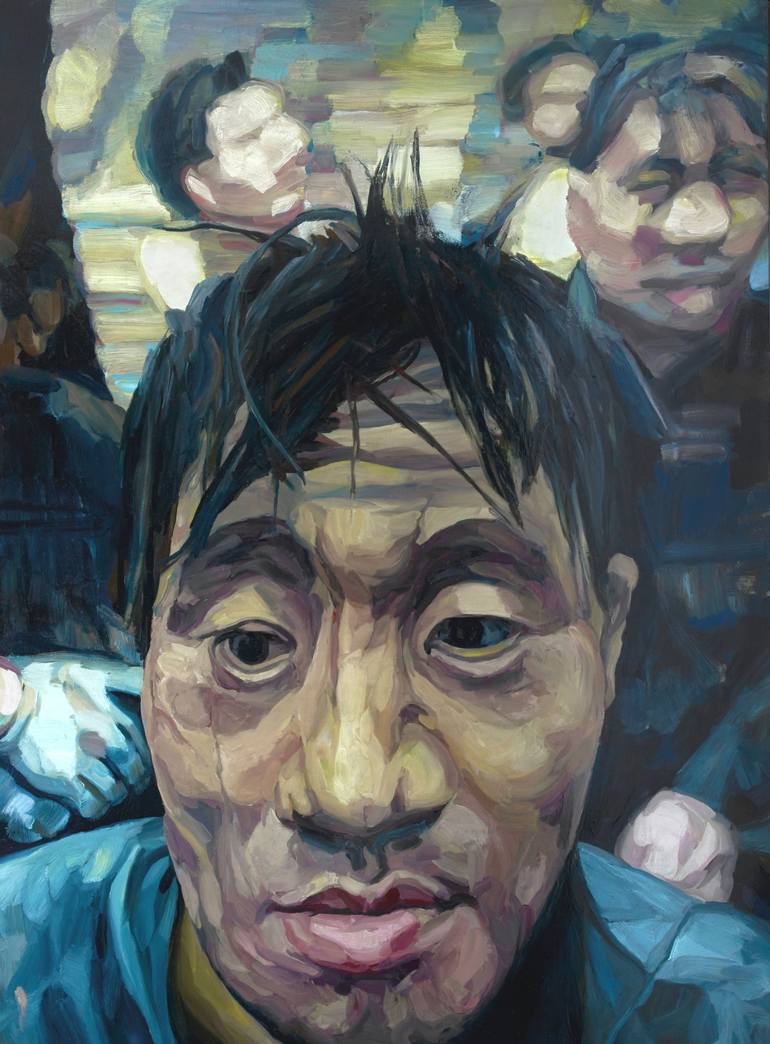 This captivating oil on canvas painting, "Tragic characters : The Chinese collier - 01" marks a powerful departure into figurative art. The artist, known for abstract works, confronts reality by portraying a Chinese collier, a poignant representation born from a newspaper photograph. The source imag...
