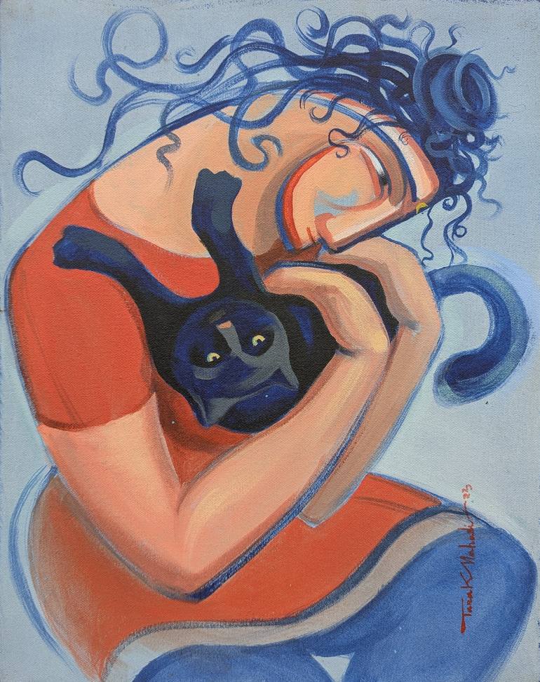 A figure with long, curly hair is shown in the painting tenderly holding a black cat. A feeling of warmth and closeness is produced by the striking red and blue colours as well as the flowing, swirling lines. The women's figure and the cat's big eyes exude comfort and affection in their relationship...