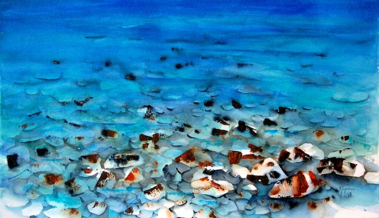 I was ispired by the transparencie and the colors of the water at the seaside. I could see very well all kinds of stones on the bottom of the sea. The colors were magical: from green / blue to deep blue in depth. The medium of watercolor is perfect for transparencies. I used Fabriano 100% cotton p...