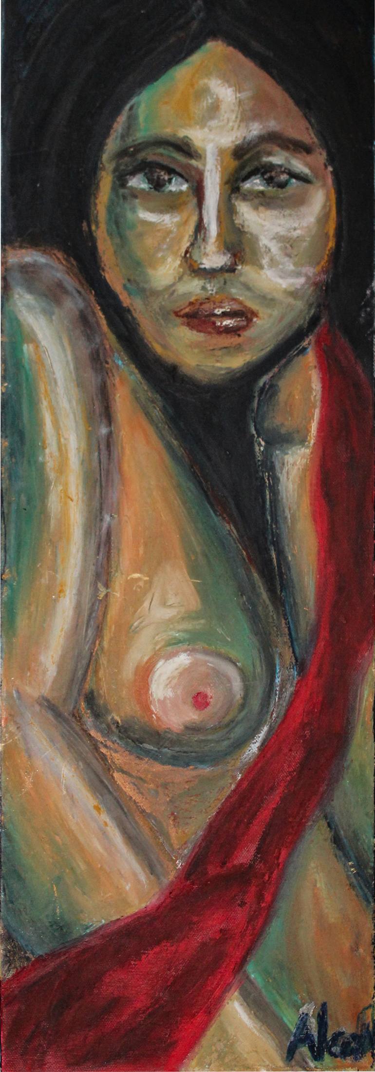 Depiction of nude woman wearing a red cloth loosely draped over her breast and shoulder